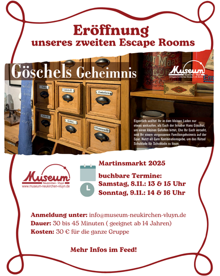 Das Museum Neukirchen-Vluyn eröffnet am Martinsmarkt Wochenende in Vluyn den zweiten Escape Room: Göschels Geheimnis. Es gibt Samstag und Sonntag extra Termine, die per Mail gebucht werden können.