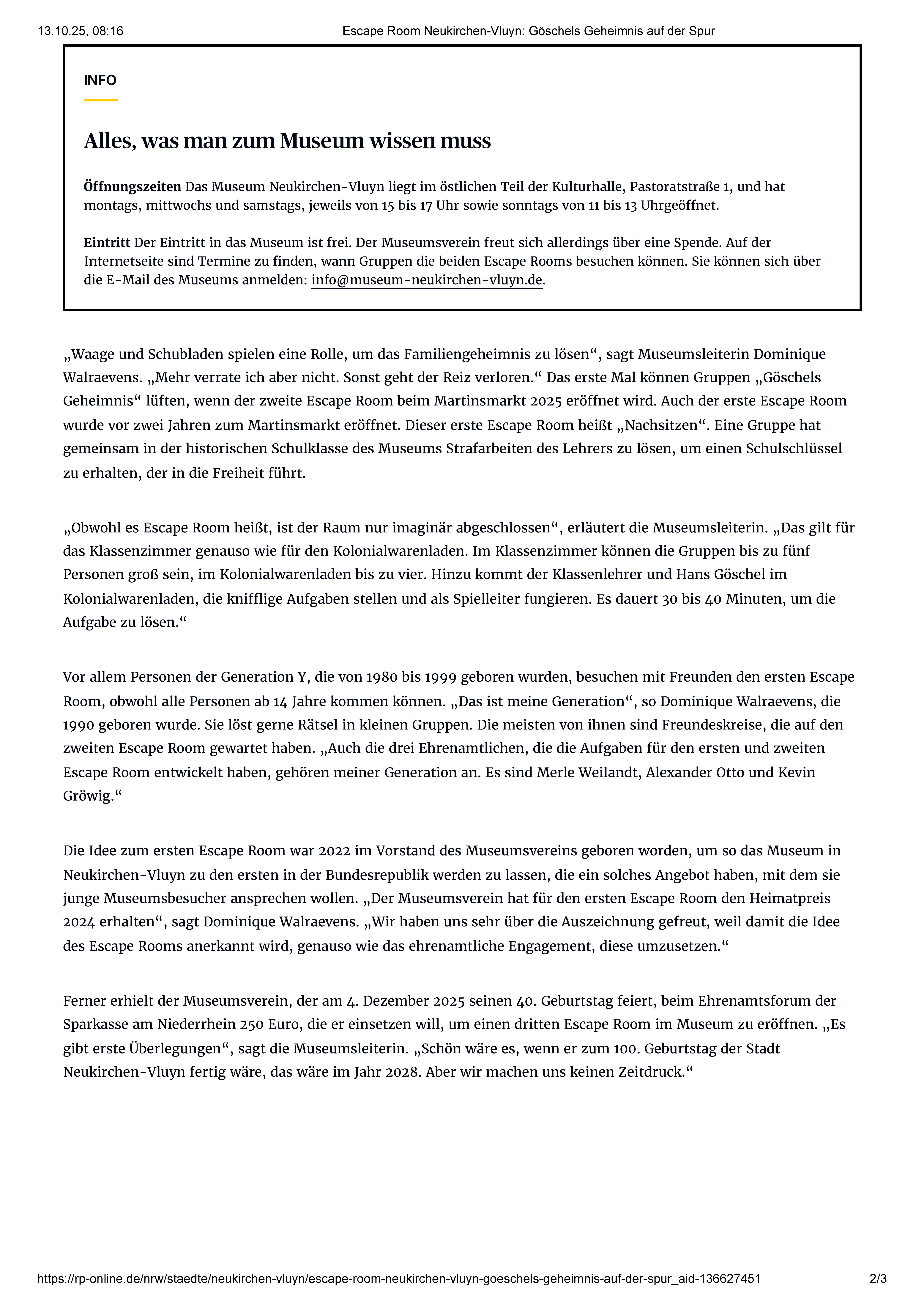 Mi + Sa 15 - 17 Uhr So 11 - 13 und 15 - 17 Uhr